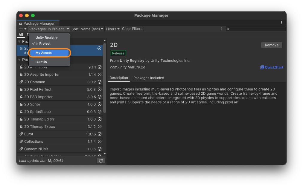 Package Managerウインドウが開くので、左上のドロップダウンリストで「My Assets」を選択します。